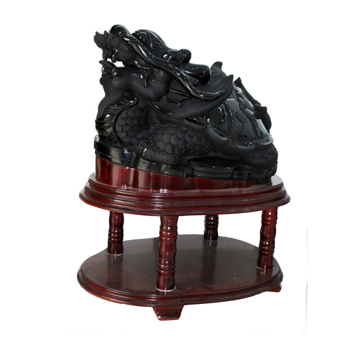 本件作品由整塊天然黑曜石精工雕琢而成,體態(tài)完美,威武大氣。以吉祥四靈之一的龍龜為題材,龍龜是瑞獸一種,形態(tài)為龍頭、龜背、麒麟尾,主吉祥招財(cái),化三煞。龍龜放在財(cái)位可催財(cái),放在三煞位或水氣較重之地最有效,風(fēng)水學(xué)有云:“要快發(fā),斗三煞”。水氣重之風(fēng)水位主是非口舌,龍龜在位能化口舌兼加強(qiáng)人緣。黑曜石是一種火山熔巖,人們相信黑曜石極度辟邪,能強(qiáng)力化解負(fù)能量。中國古代的佛教文物中,就有相當(dāng)多有關(guān)于鎮(zhèn)宅或避邪的黑曜石圣物或佛像。