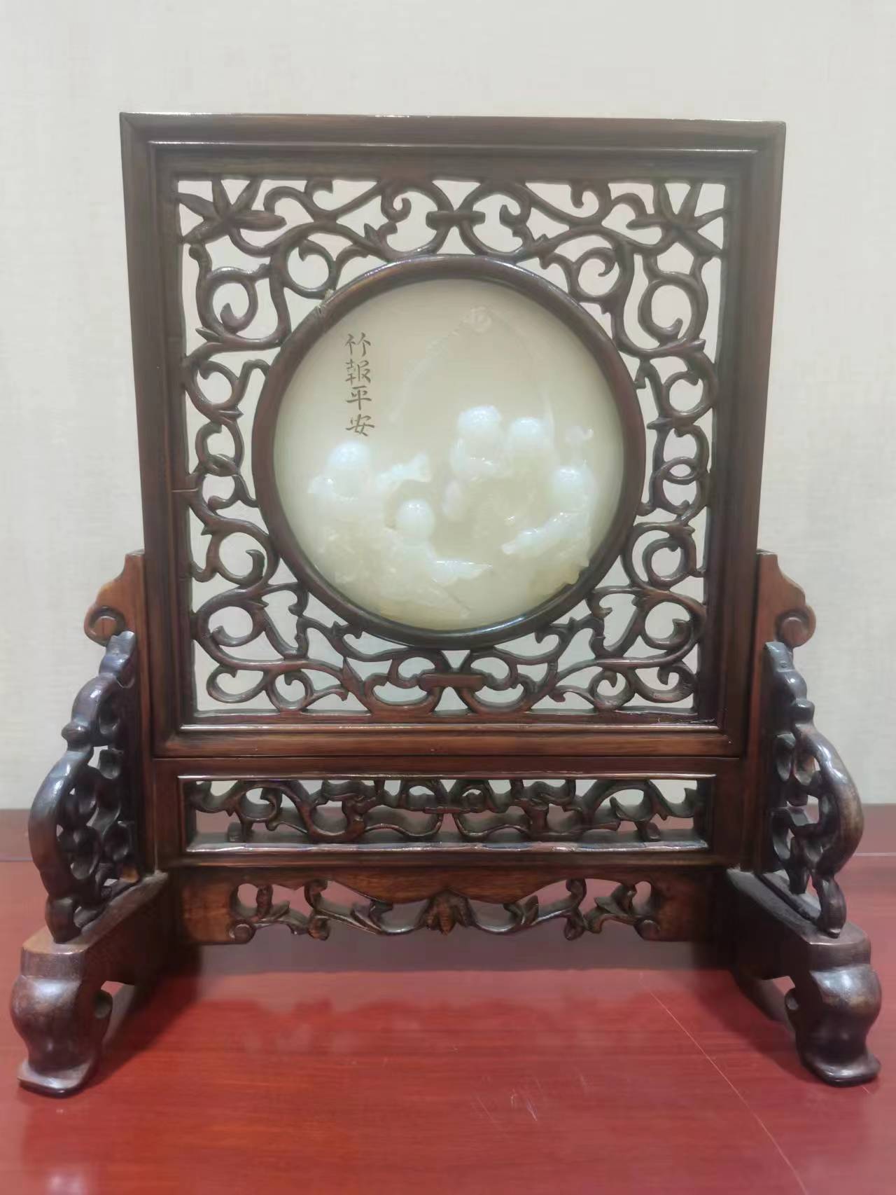 本品雕刻線條流暢生動,精致唯美。玉質(zhì)細(xì)膩油潤,靈動閃亮。裱藏于紅木屏風(fēng)中,古色古香,別具韻味,無不體現(xiàn)收藏者高雅的氣質(zhì)和品味。