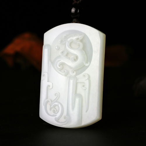 此款和田玉龍牌,色潤白、質細膩。造器較有特色,上減地浮雕螭龍居于上,昂首挺胸,盛氣凌然。下有造型寫意抽象的鳳首回眸,似聞鳳鳴九霄,靈韻之氣畢現。整牌彰顯大器穩重,可謂賞之有味。且大小適中,可佩戴,也適于把玩。
