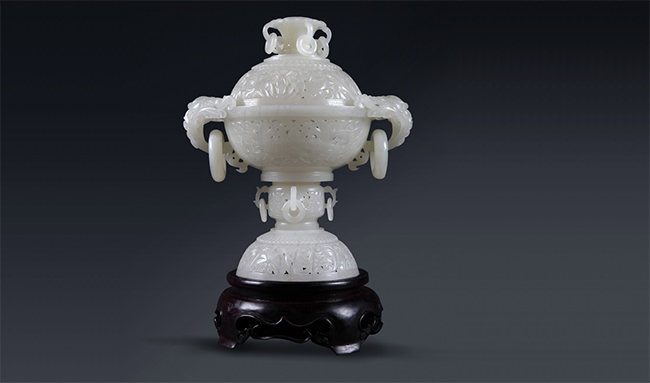 玉質潤白細糯、晶瑩飽滿、料大難得,細膩滋潤如羊脂,通透如瑩瑩白雪。整體以立體鏤雕為主,刀法精細,隨形施藝,惟妙惟肖的圓巧妙融入其中,構成香薰爐吉祥圓滿的視覺效果。雙耳如意設計,體形弧曲圓渾,弧度對稱自然,雙耳鏤空懸掛圓環,清潤富貴中包含著古樸雅致之情。作品將玉堅潤不渝的美德與如意的吉祥寓意結合,與中國文化高度契合,不僅極具美感,更傳遞出富貴吉祥、福氣安康、財運連綿、節節高升等美好祝福。