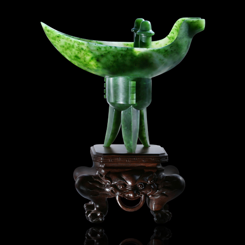 爵是中國古代一種用于飲酒的器皿,以不同的形狀顯示使用者的身份。碧玉的色澤與古銅器經過千年而變成的顏色和質感極為相似,因此以之仿青銅器極為精妙典雅。
