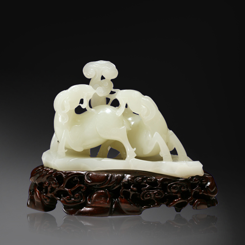 白玉質,玉質上佳,無雜質,瑩潤如凝脂。圓雕兩只羊和大如意,寓意吉祥如意。造型簡潔明快,刀工精湛,打磨潤澤,更因其質地潔白無瑕,使羊之溫順的性情與肥美的體態得以極好的展現。