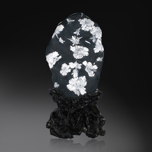 天然菊花石是瀏陽(yáng)河天青石中含凸鏡狀灰?guī)r,經(jīng)數(shù)億年地質(zhì)變化,演變而成。乳白色天然花形,酷似盛開的朵朵菊花,紋理清晰,界線分明,質(zhì)地堅(jiān)實(shí),花形千姿百態(tài),蔚為奇觀,潔白美麗的花瓣是由天然的天青石和方解石組成。中華人民共和國(guó)地質(zhì)礦產(chǎn)部將其列入寶石類,并命名“玉疊妃”。因其蘊(yùn)量稀少,比珠玉寶石類更珍貴。故又被稱為“全球第一”。 菊花石的發(fā)掘,雕刻成工藝品,則始于清乾隆年間,當(dāng)時(shí)只作宮庭貢品,后才在民間流傳。一九一五年巴拿馬萬(wàn)國(guó)博覽會(huì)上,菊花石雕“梅、蘭、竹、菊”橫屏參展,榮獲金獎(jiǎng),震驚世界,驚嘆“石頭能開花”,從此享譽(yù)全球。