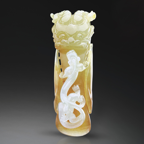 翡色亮麗純凈,潔白螭龍摘色自然,晶瑩剔透。