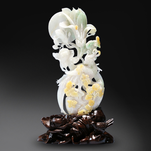 大塊天然翡翠原料以圓雕、鏤雕技法雕琢,一輪朝陽冉冉升起,富貴花兒盛開,美麗的鳳凰俏立枝頭,名為“丹鳳朝陽”,吉祥喜慶,讓人十分喜愛。
