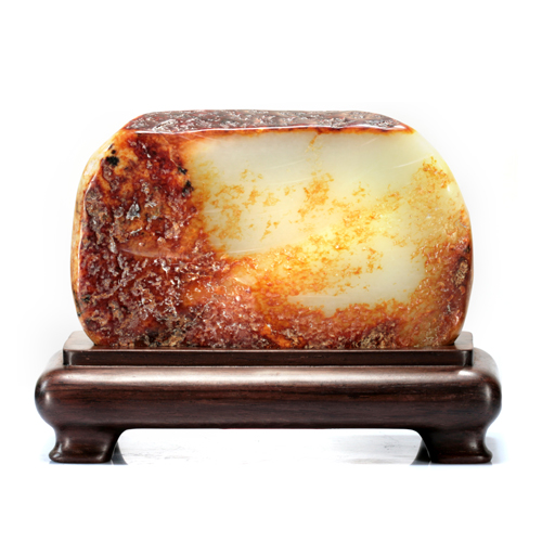 玉質細膩縝密,油潤細濡,整器厚重,敦厚優美,全身覆艷麗皮色乃棗紅與濃淡不一的黃色相間,醒目喜慶,色澤誘人。其尺寸大小適正,展、供、仰、賞俱佳。